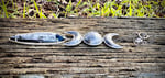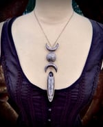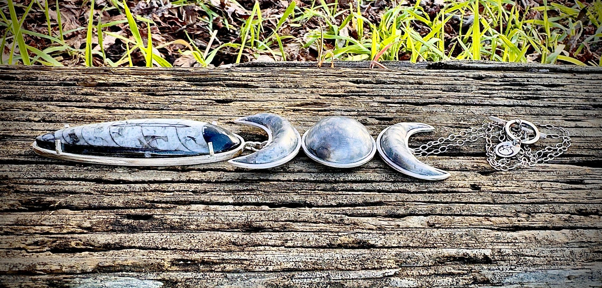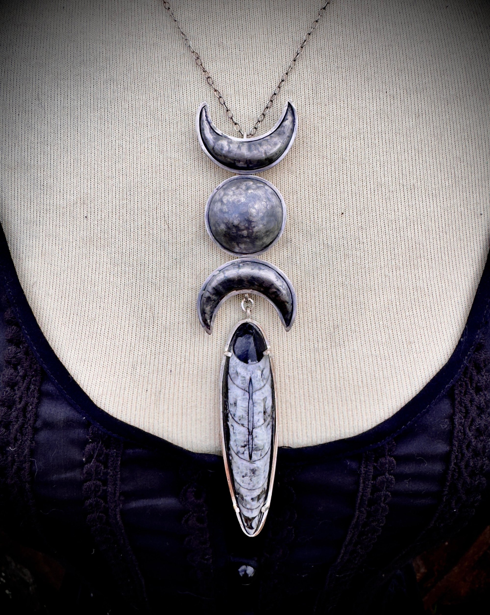 Shaped using the technique called Repousse. Necklace is 17" and the drop of the pendant from tip of moon to bottom of fossil is 5.75" Widest moons are 1.25"