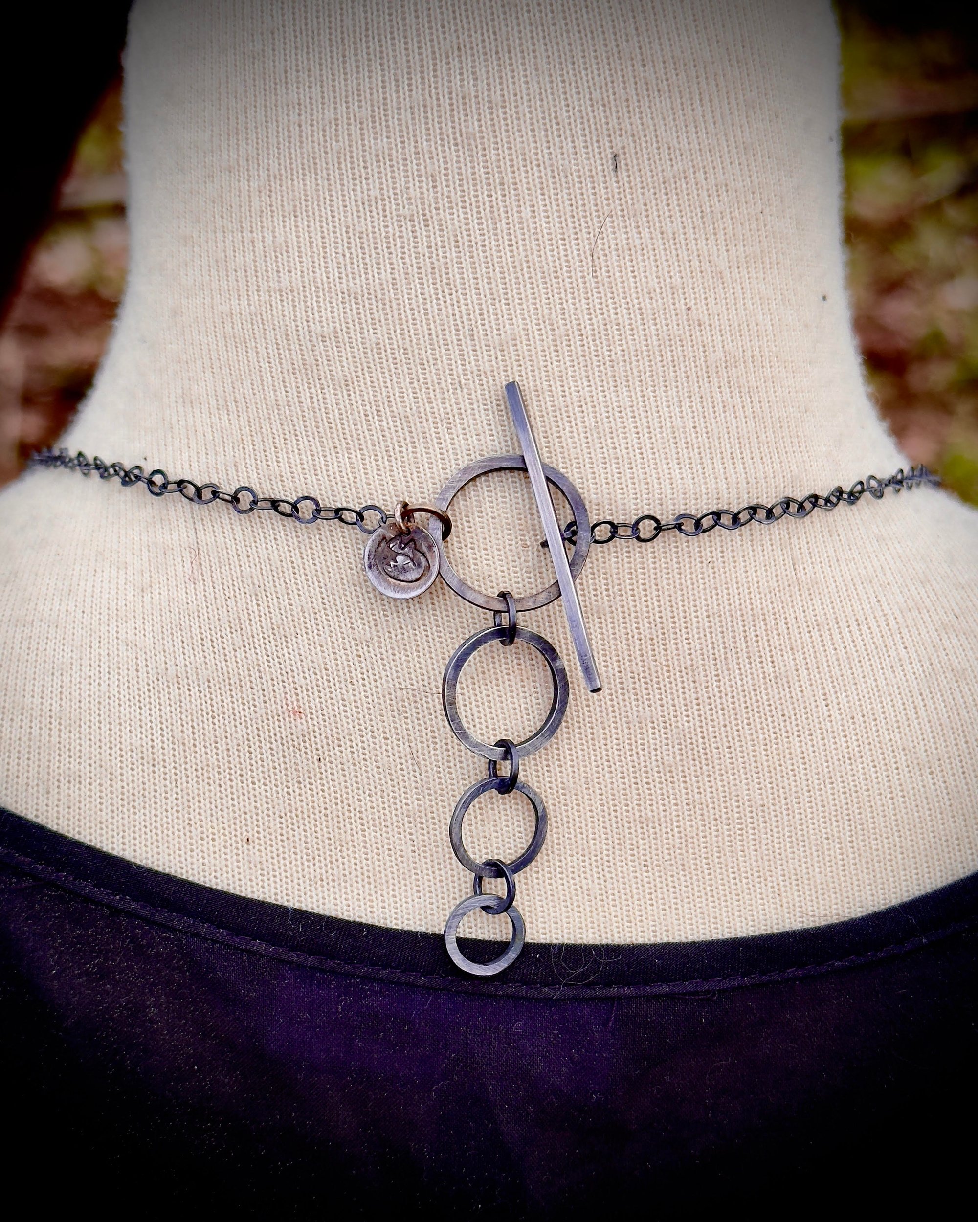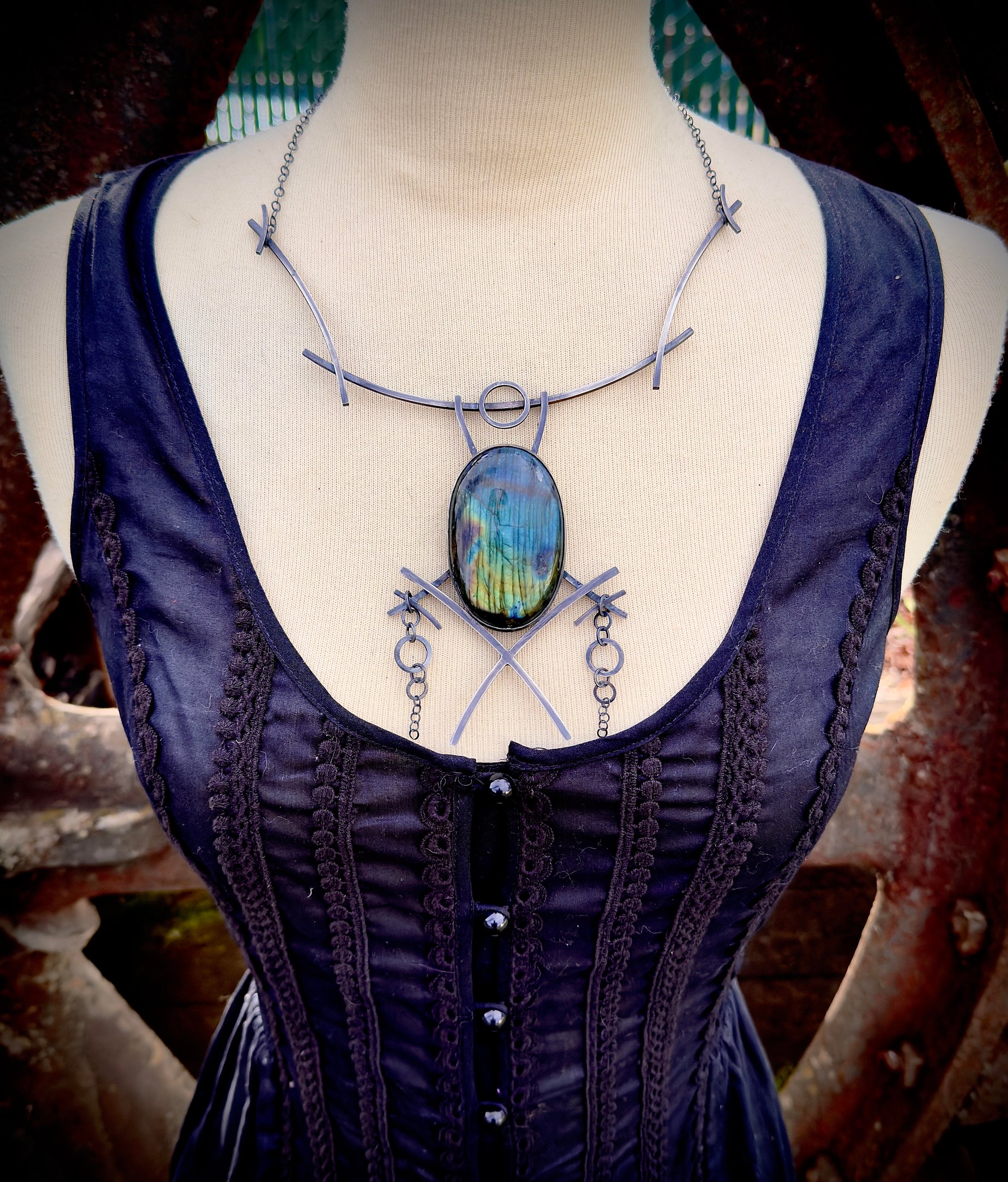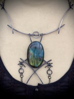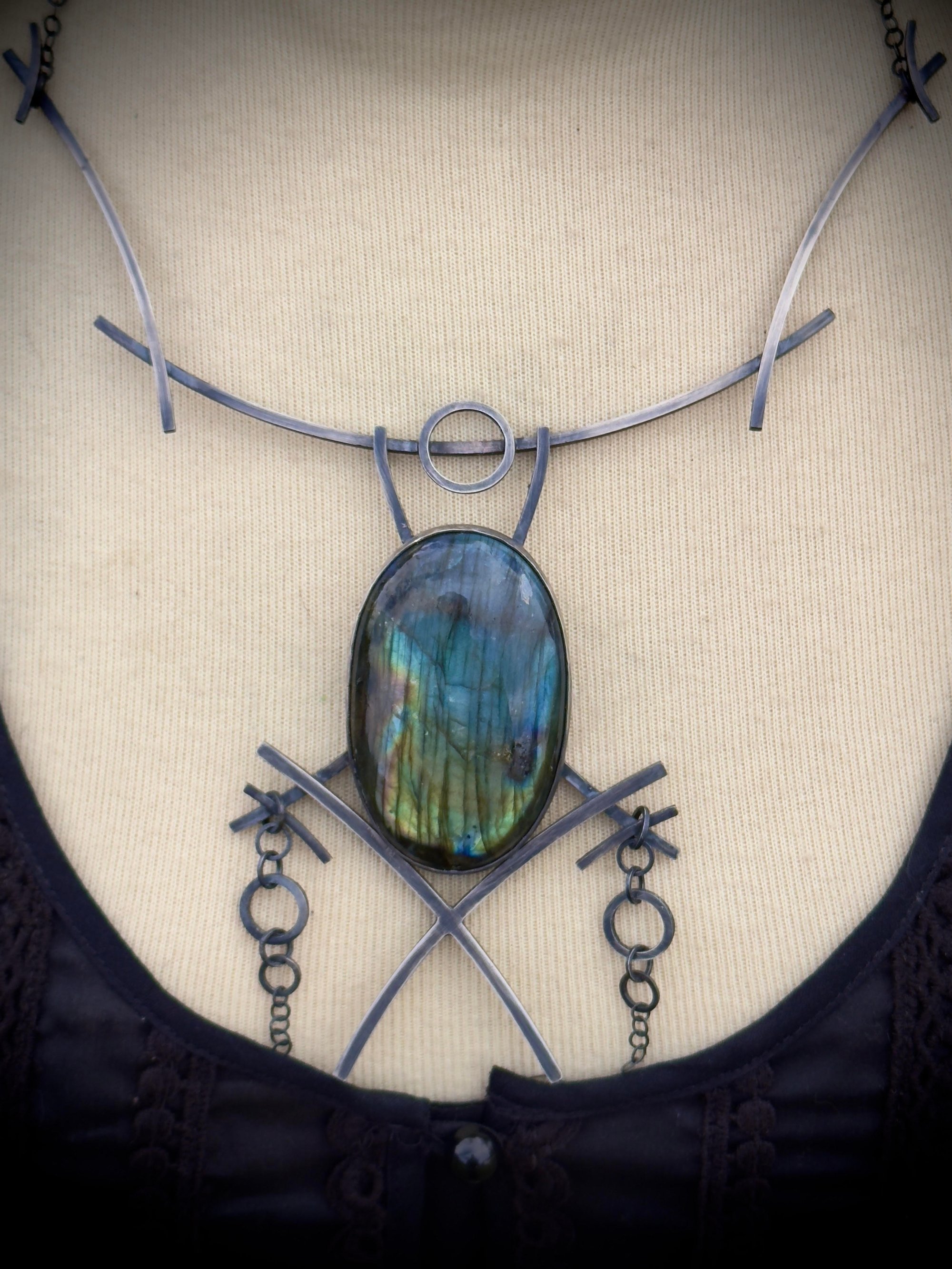 The chain/neckpiece measures about 19". the Labradorite stone measures 2.25", and the whole drop of the design from the neckpiece is about 4.5". The "arms" measure 3" across, stemming from the stone.