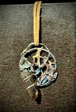 Talisman is about 2.5” long and 1.75” wide, leather tie is 2.5” long.