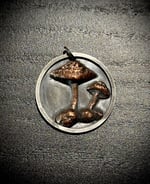The copper mushrooms were formed using a technique called repousse. Then cut out and soldered onto a Sterling silver back.