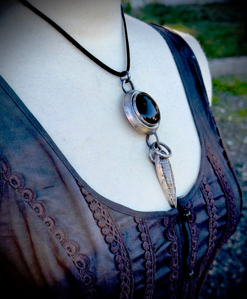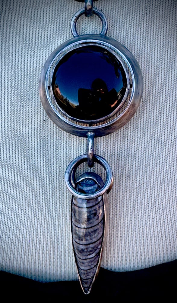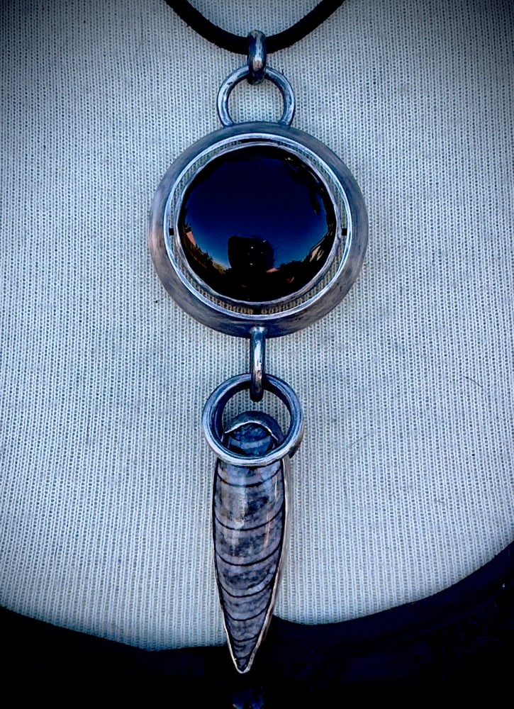Necklace measures 16”, drop of pendant is 5”, width of circle is 1.75”, orthoceras fossils is 2” long