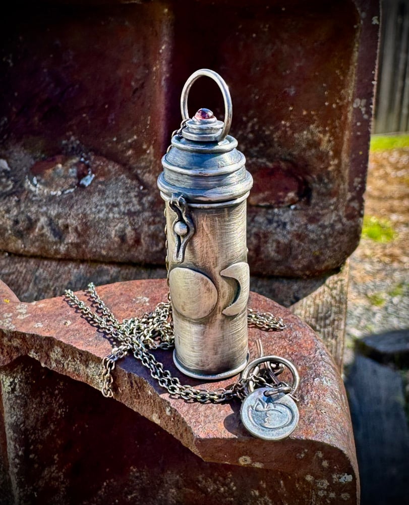 The locket is 1.75” from garnet to bottom. the diameter is .50” and the chain is 24”long. Comes with a small pile of handmade paper to write intentions on.
