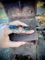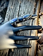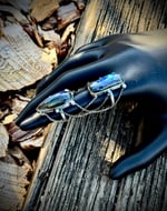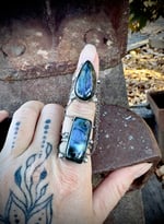 Largest square ring is size 7.5, teardrop top ring is size 4. Both stones are 1.125” long, and about .5” wide.