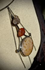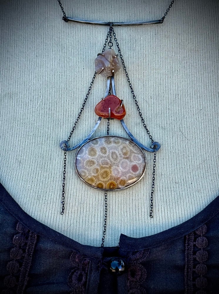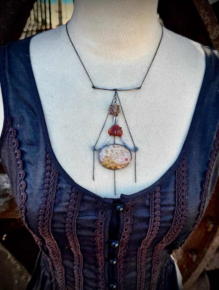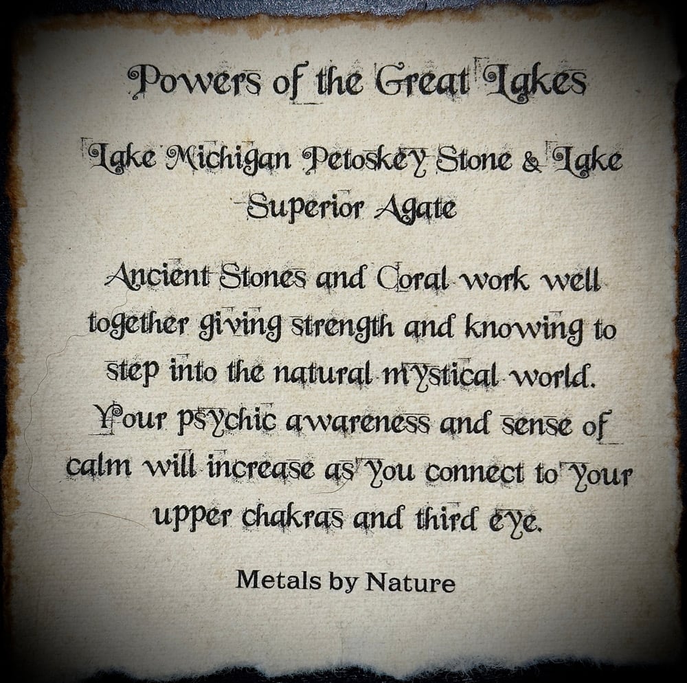 Ancient stones and coral work well together giving strength and knowing to step into the natural mystical world. Your psychic awareness and sense of calm will increase as you connect to your upper chakras and third eye.