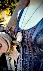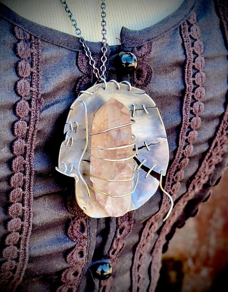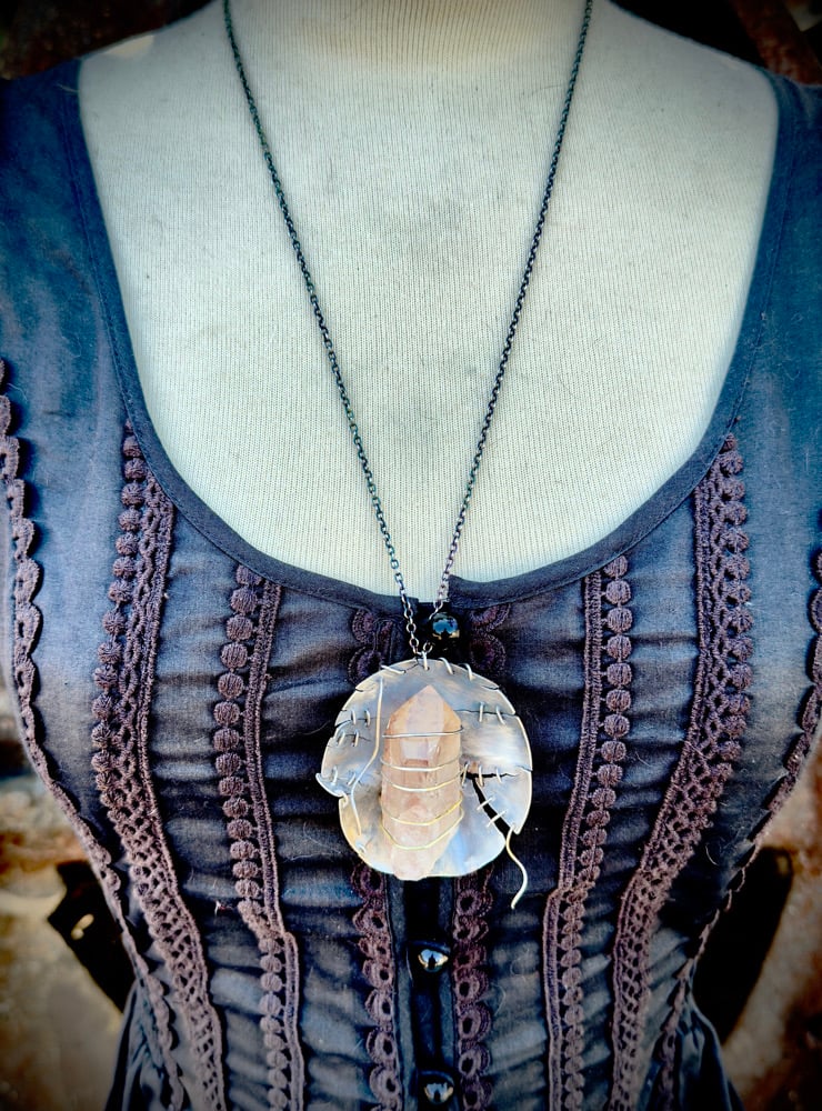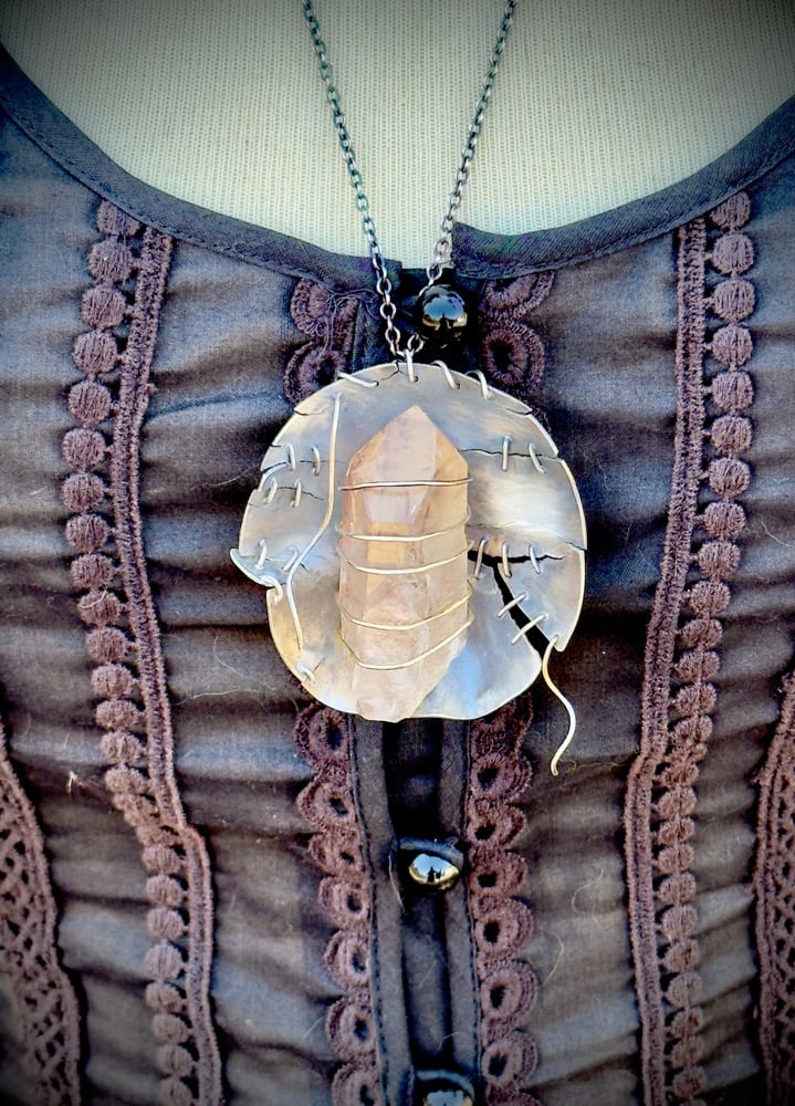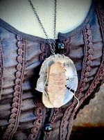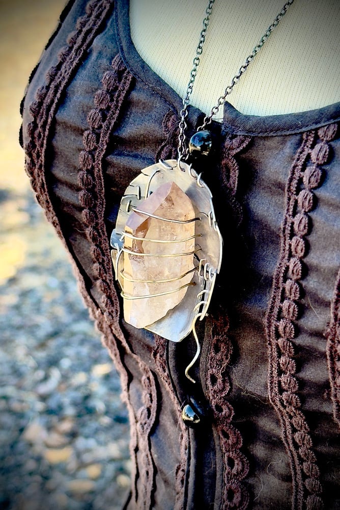 Chain of necklace is 25” long, drop of pendant is 2.25”, length of Smokey quarts is 2”