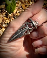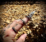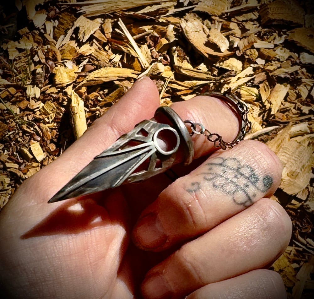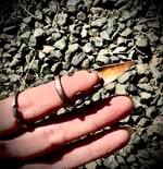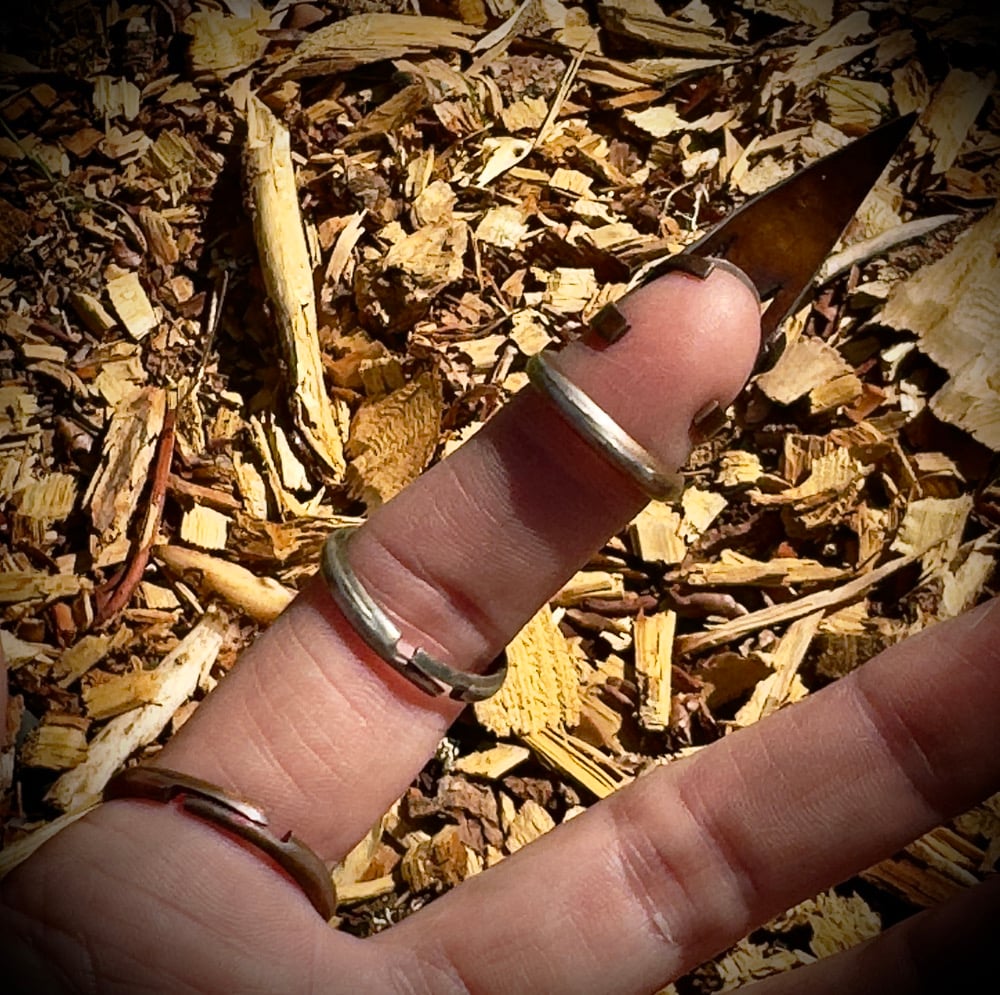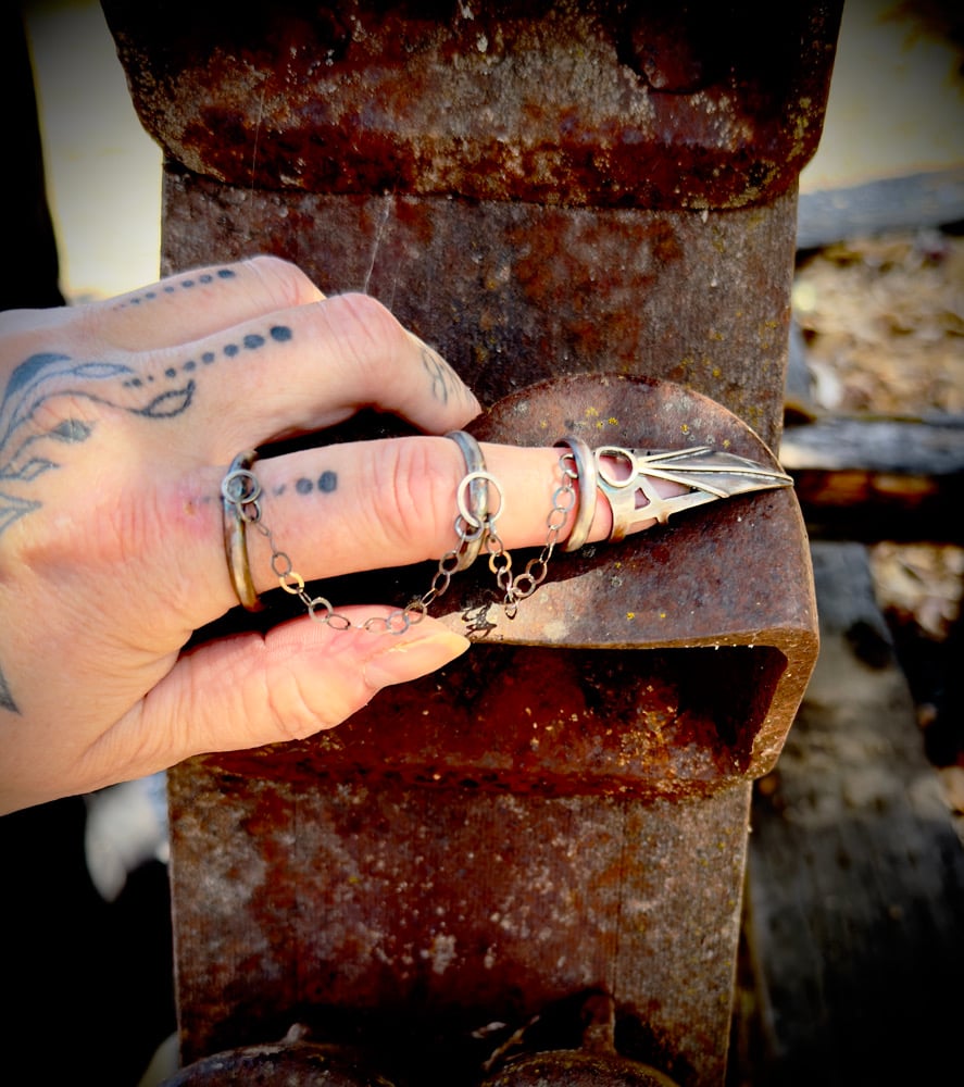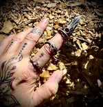 Large ring size. Largest ring closest to hand is 11.5, and can be adjusted larger. Middle ring is 8.5 and can be adjusted larger. Finger tip ring is size 5 (not adjustable)