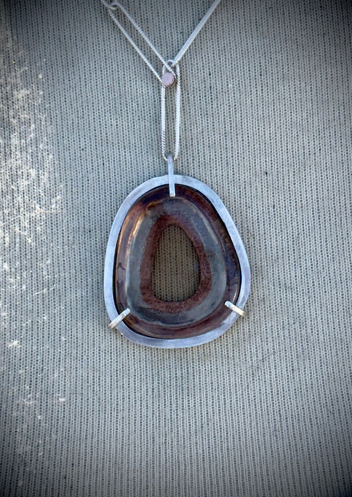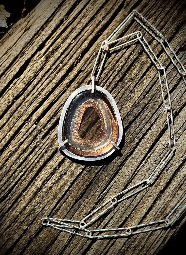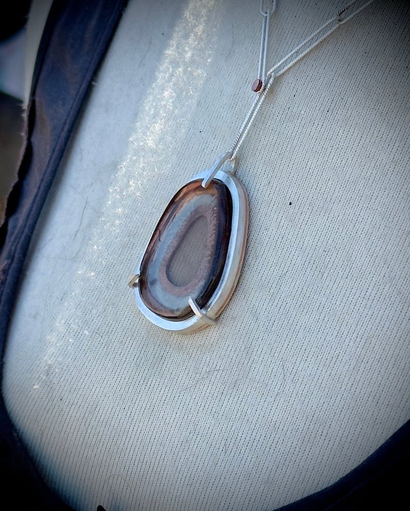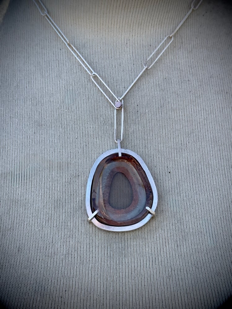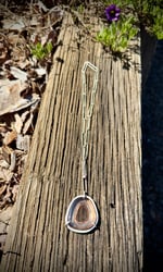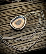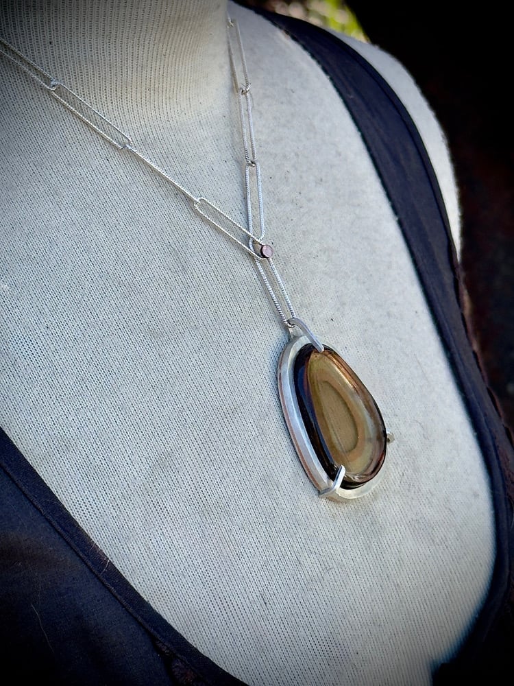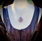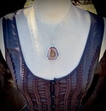 Necklace is 16”, front closure. Pendant drops 2.5”, stone is 1.5” long and 1.25” at widest